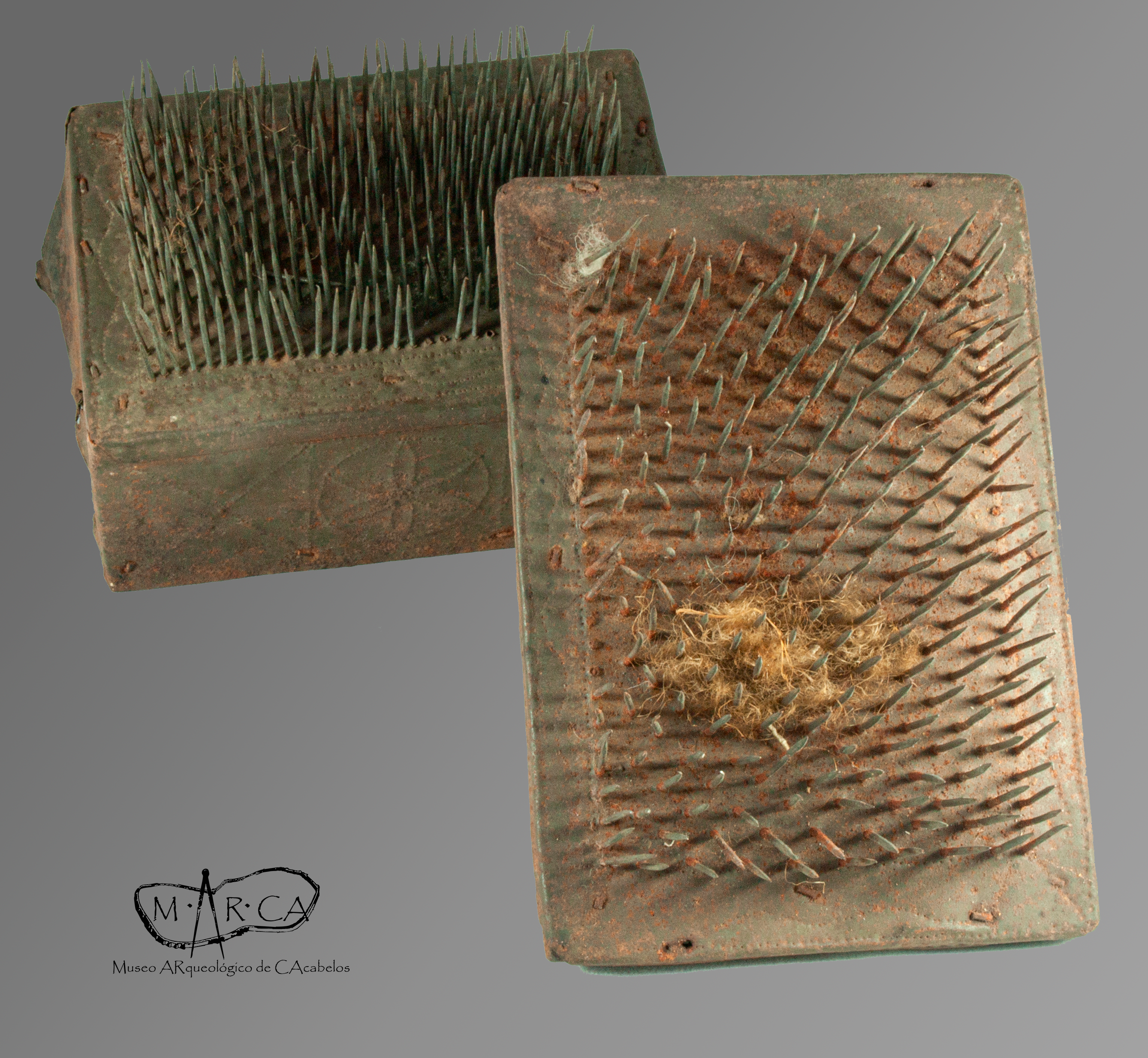 Las piezas de este mes son dos cardas, que estarían unidas a una tabla de madera. Las dimensiones son de unos 13-15 cm por 10-12 cm. Las púas de ambas cardas son distintas, con un tamaño y separación entre ellas diferente. Esto puede responder a diferentes fases del cardado, siendo la más grande de un momento previo en el que el lino estaba menos depurado.
